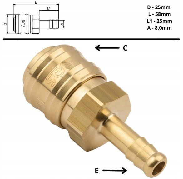 - Strona E - Wtyk do węża o średnicy wewnętrznej 8 mm
